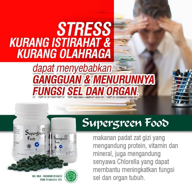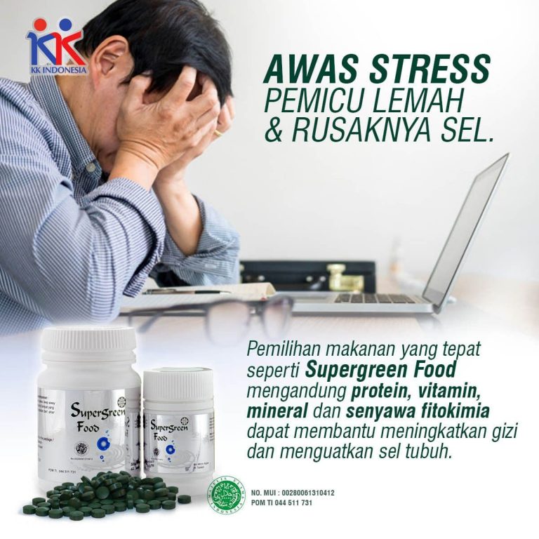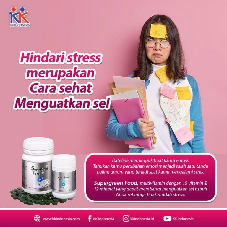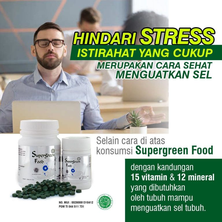 Supergreen Food, multivitamin dengan 15 vitamin & 12 mineral dapat membantu menguatkan sel tubuh kamu sehingga tidak mudah stress. Karena menghindari stress adalah salah satu cara menguatkan sel tubuh.