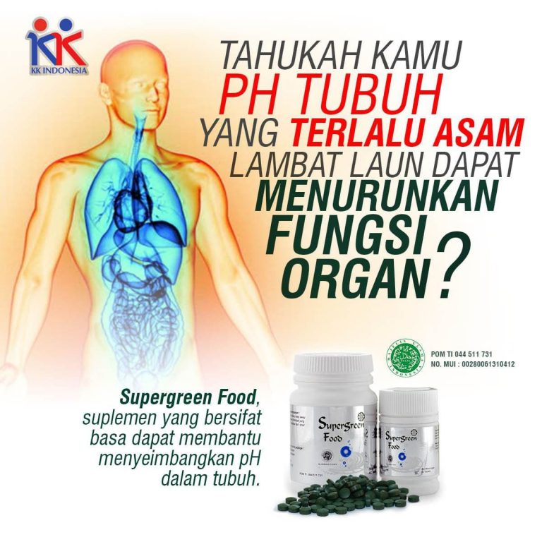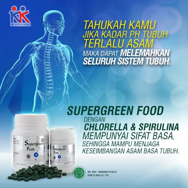 KK Supergreen Food merupakan multivitamin dengan 15 vitamin dan 12 mineral yang bersifat basa yang dapat membantu menyeimbangkan pH di dalam tubuh.